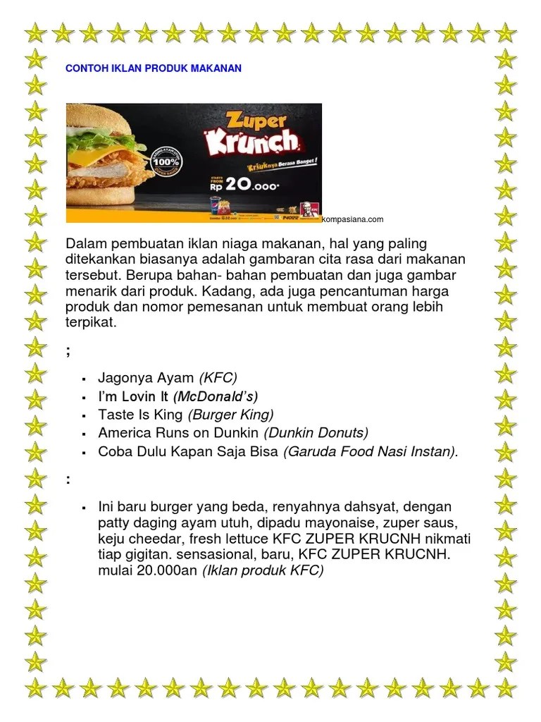 Utama arrow makanan arrow produk makanan. Children advertising analysis of foods and beverage products in television in the reasearch to penetrated by media ethics and local wisdom. Tujuan penelitian ini untuk mendeskripsikan variasi bahasa jepang dalam iklan produk makanan dan minuman jepang, yang halal atau haram serta komposisi yang . Contoh iklan produk makanan ringan. Mula dari tertarik menyimak, tertarik mengikuti sampai iklan habis, sampai tertarik untuk mencari tahu lebih dalam produk yang .
