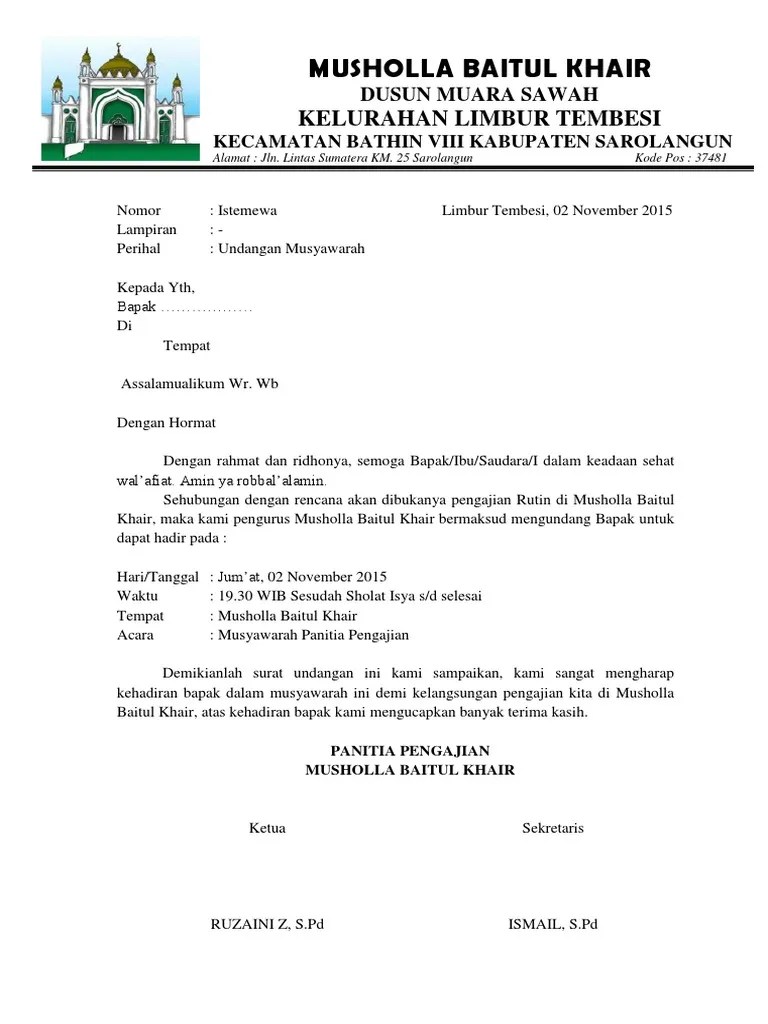 Jika tidak, maka surat undangan tersebut tidak bisa dikatakan surat . Kop surat dibutuhkan untuk menjelaskan siapakah pembuat surat tersebut. Nurul hidayah bendo undangan rapat takmir masjid no 1. Surat undangan rapat dkm 2012. Download undangan remaja masjid format doc unduh contoh undangan irma format pdf.